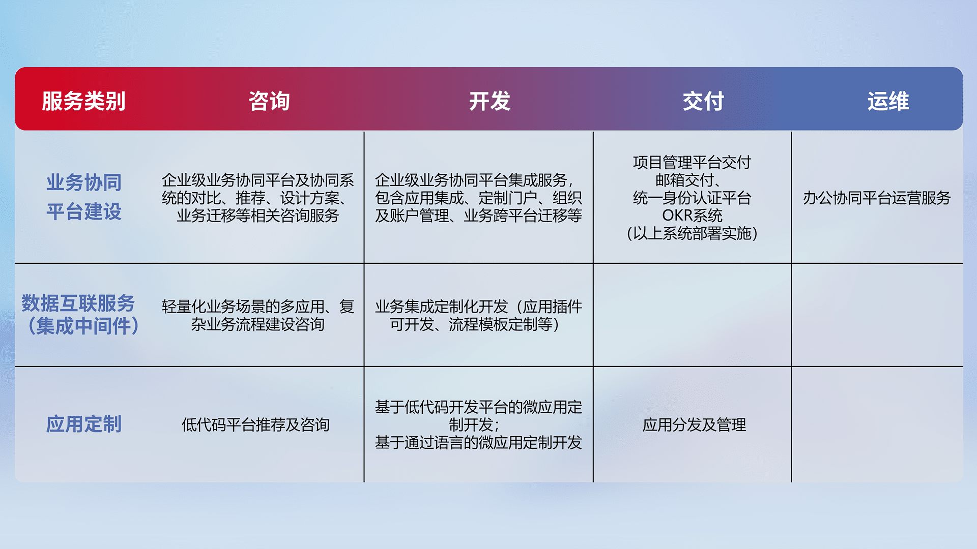 针对钉钉、、、、企微、、、IDaas等平台级产品提供产品的规划、、方案、、、交付、、、定制化开发等服务,,,实现如统一协同办公、、、智能客户服务、、、、混合会议管理、、、智能数据查询、、、、等业务场景,,,实现数字化转型。。